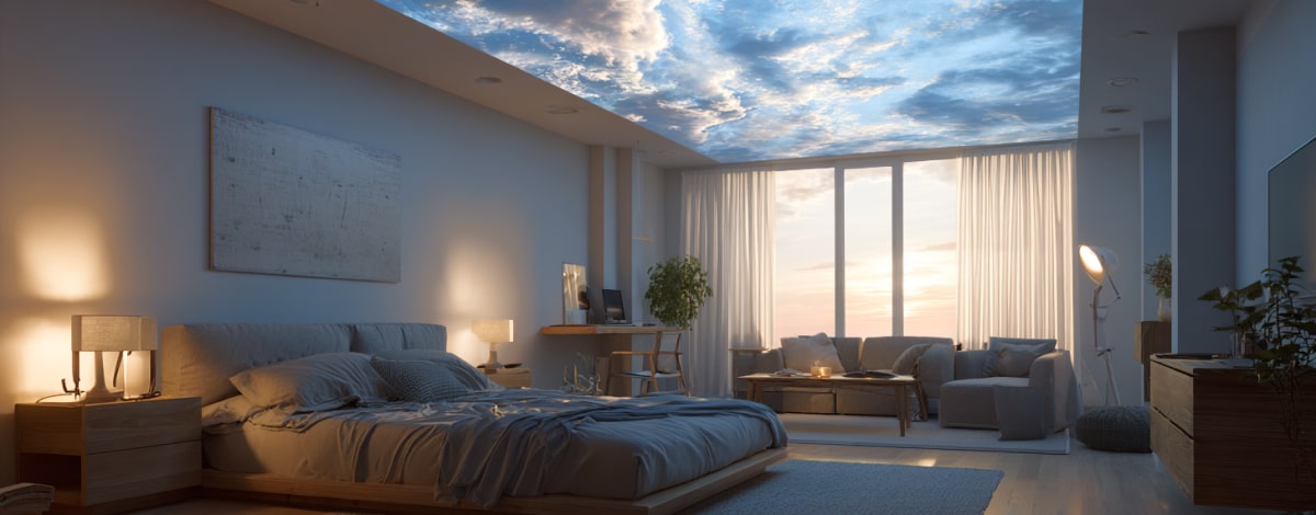 - Для темных помещений закажите полотно с изображением неба и скрытой подсветкой с имитацией пробивающихся лучей солнца.